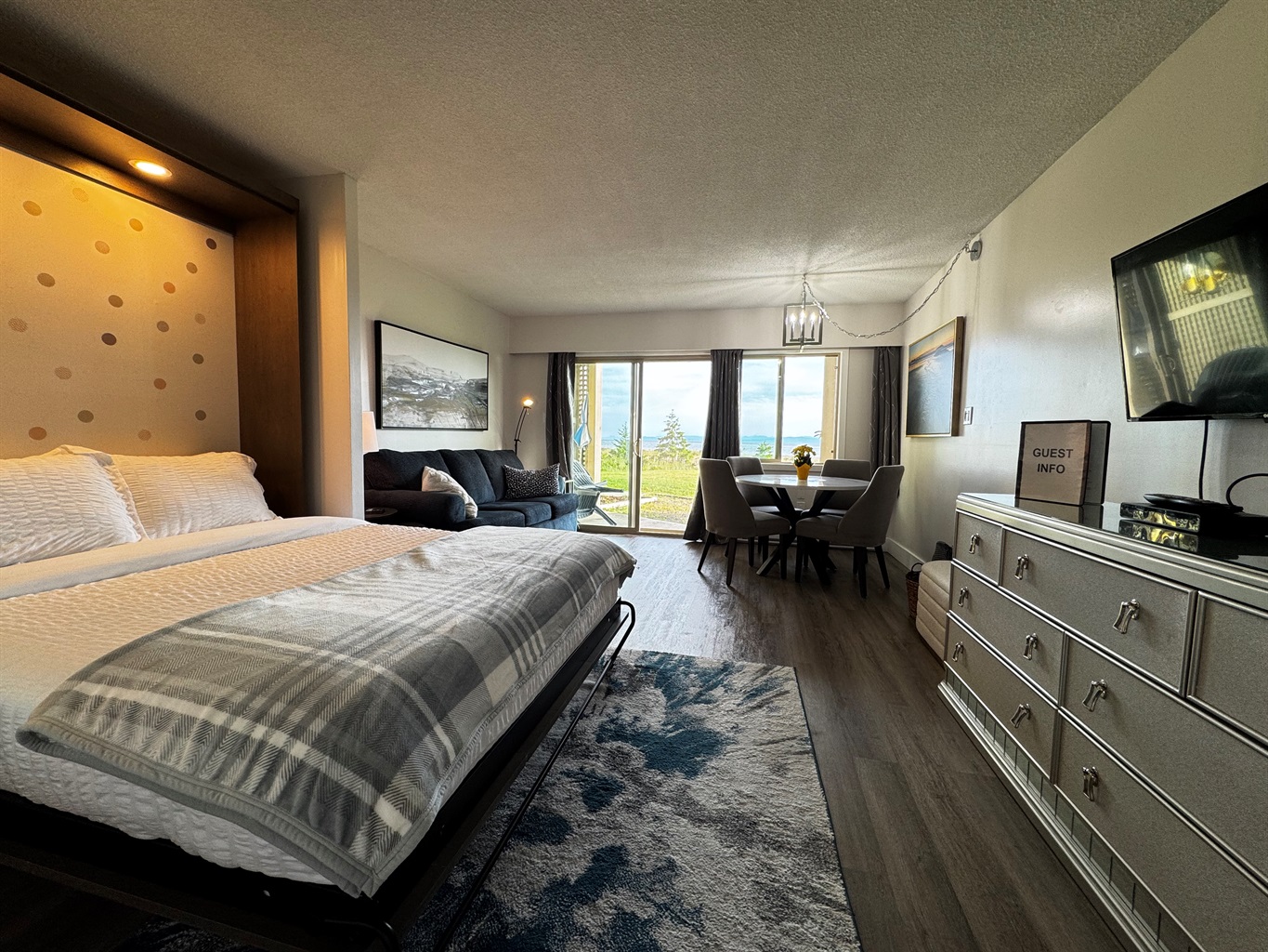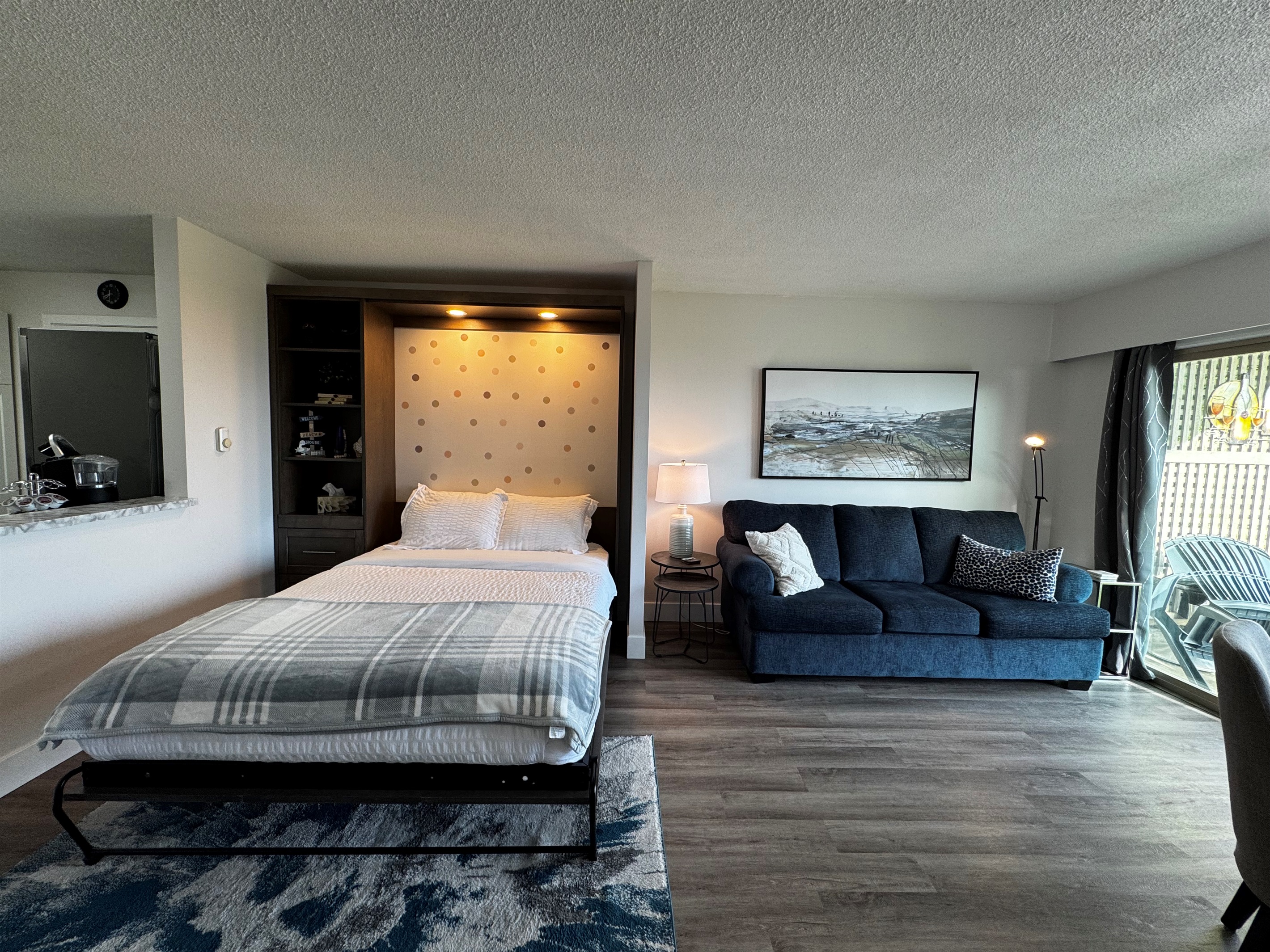 1 Bathroom 1 Bath • Sleeps 1-4Welcome to your licensed vacation rental, the ultimate beachfront walkout condo at Shorewater Resort. This inviting suite features a comfortable Queen bed and a pullout couch, making it perfect for couples, small families, or anyone seeking a peaceful and relaxing getaway. Step directly onto the beach from your no-stairs suite and immerse yourself in the beauty of Qualicum Beach.